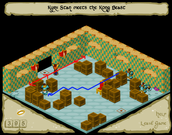 First, go straight down and pick up the potion. Come back up to the square you started on, and move straight right. When the elephante is trapped go around to the front of the 4 "tables" and to the right. You should have a ring saved from earlier levels, if you followed my walkthrough. If so, use it to sneak past the right guard and grab that ring, then quickly back out.