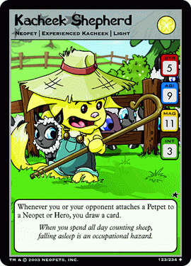 neopets have an effect. To play an experienced neopet, you need to have a certain type of basic pet in an arena. For example, to play a Kacheek Shepherd, you need to have a basic Kacheek on the field and a light neopet. The basic neopet then becomes that experienced neopet. So a Blue Kacheek would then turn into a Kacheek Shepherd when you played the experienced