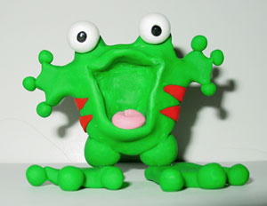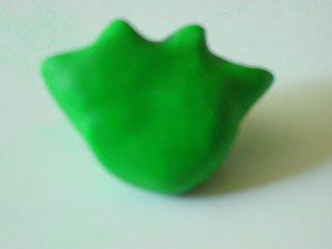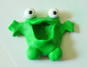 This is by far the most difficult part. Don't get too concerned at making the mouth perfect right away, because you WILL mess it up in the next few steps. Just shape out the general shape of the mouth, using fingers, toothpicks, whatever. Look at the happy Quiggle image on Neopets and shape the mouth more or less like that. Remember the mouth takes up most of the body. In this image I have also started to form the hands and fingers, much the same as the feet were made in step 4.