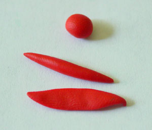 Make 4 small balls (about the size of the big middle toe on the Quiggle's foot) out of RED clay. Put your finger on one side and roll back and forth till it is pointy. Do the same on the other side. Now flatten the whole thing down. Repeat for all 4 balls. Place the stripes on the sides of the body, wrapping to the back (look at step 15 for positioning).