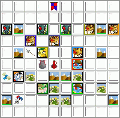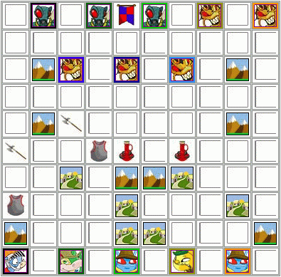 The Playing Grid measures 10 by 10 squares. Some of the squares will be taken by items, some by players, and some by non-passable objects. To move your troops, first select one by clicking on it once, then click on the square you wish to move to. Remember, you can move in any direction, but only one space at a time (unless you are a skeith using a teleport amulet), so if you click on a square that is out of range, nothing will happen. You cannot pass mountains, or villages, so clicking on those will not get you very far :) If you move on a square with an item, the item will automatically be used by your soldier. Clicking on a square with an enemy present, (if you are in range 1 space away) will make your soldier attack the enemy. If you have a Grundo equipped with a Magic Spell of Force you may click on any of your own soldiers to heal them, but only if the soldier has an available move