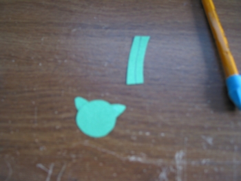 Glue the ears to the head. Make sure the side with the pencil marks is facing down. When gluing, I would suggest gluing the ears behind the head. This makes it look a bit nicer, and hides some unsightly paper lines. Now, you can draw/cut out a bow- curved rectangle shape, like the one shown. Draw a line in the center.