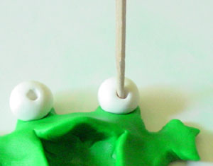 Now make some very tiny equal sized balls of black clay, and place them over the holes made in step 9. Push them down some to cover the hole and so they don't fall out.