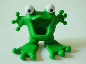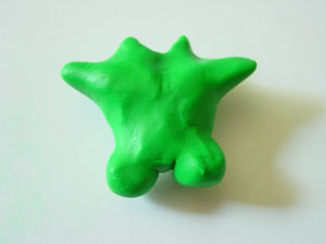 Use the final block of green clay from step 3. Pull off little bits of clay and roll them into balls that will become the toes. The ones for the feet will be larger than those for the hands. Smooth them to the bottoms of the feet and back of the hands the way you did with the legs in step 6.