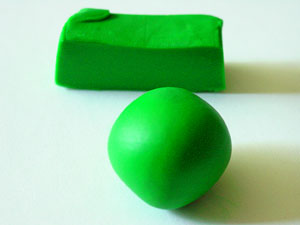 First, take the block of green clay, and cut it in half. Play with half of it until it is nice and soft (you will repeat this with any of the clay before using it). Roll it into a big ball.