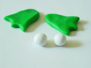 Cut the remaining green clay into 4 approximately equal pieces. Two will be used for the feet, one for the knees, and one for the toes.